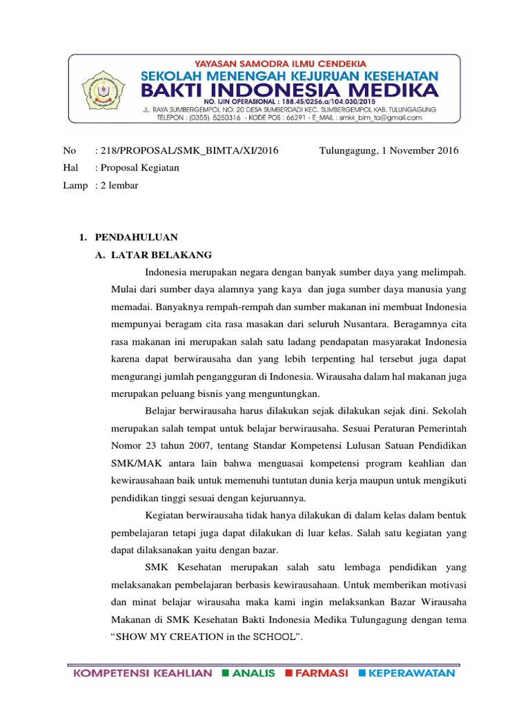 Proposal Bazar from imgv2-2-f.scribdassets.com Apakah kalian pernah mendengar istrilah dari proposal kegiatan? Panitia pelaksanaan kegiatan bazar sekolah menengah kejuruan negeri 2 pekanbaru. Atas bantuan dan partisipasinya dari segala pihak kami ucapkan terimakasih. Bazar yang disediakan terbatas karena bazaar yang disediakan bersifat sosial artinya tidak sepenuhnya. Latar belakang dengan banyaknya kesenian atau hasil kerajinan tangan dari murid — murid di sekolah, sekiranya kami dari pihak sekolah khususnya guru kesenian untuk mengadakan bazar. Contoh proposal kegiatan bazar buku. Ketika berkecimpung di dunia organisasi pasti kamu akan banyak membahas mengenai proposal. Perbedannya jikalau proposal kegiatan harus bisa mencerminkan kegiatan yang akan akan dilkukan.